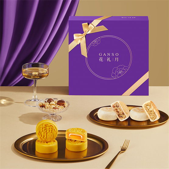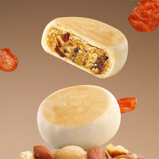 “花禮月”禮盒的基石,在于其對傳統蘇式糕點工藝的堅守與尊重。蘇式月餅的精髓在于其酥皮,而元祖對此毫不妥協。禮盒中的2款口味月餅—經典百果味和椒鹽果仁味,用傳統烤制蘇式工藝,在制作過程中,油皮油酥黃金比例,純手工包制,二段式烘烤。